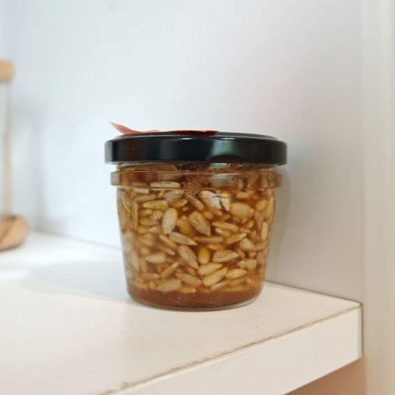 Семена тыквы залиты медом урожая 2023 года в стеклянной банке объемом 105мл, плотно закрыт крышкой ТО - 63.