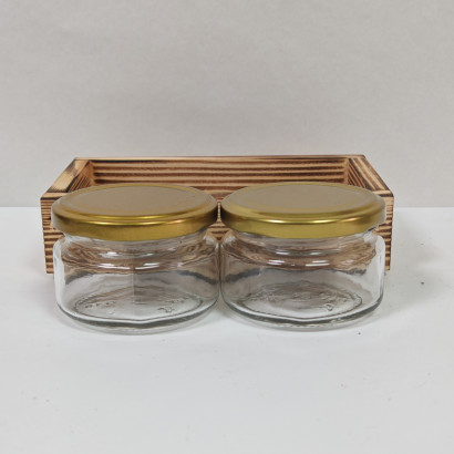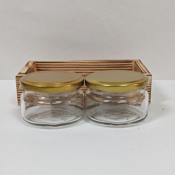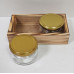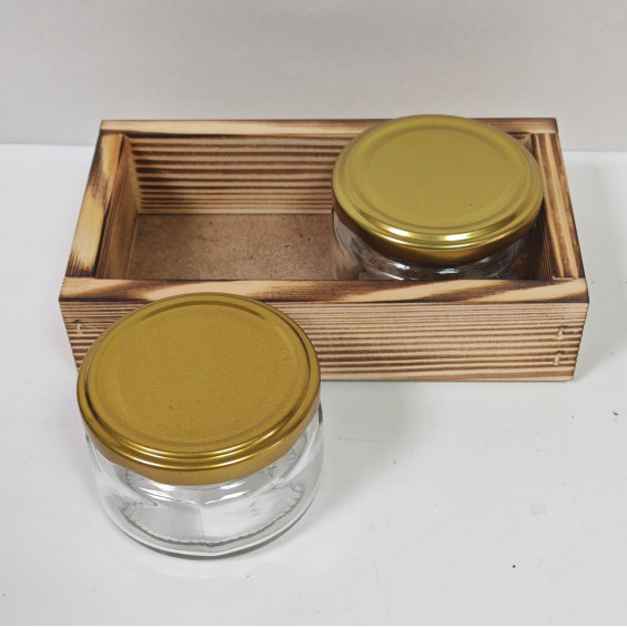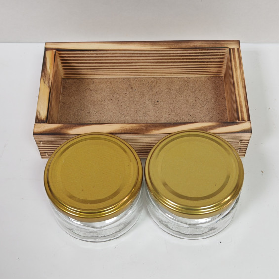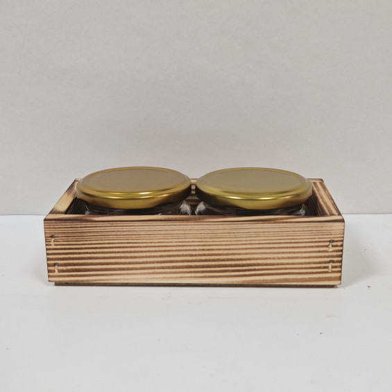 В наборе: 2 баночки, 2 крышки и деревянный бокс.