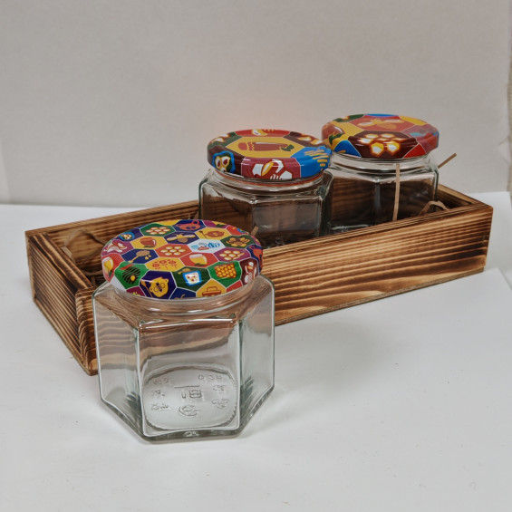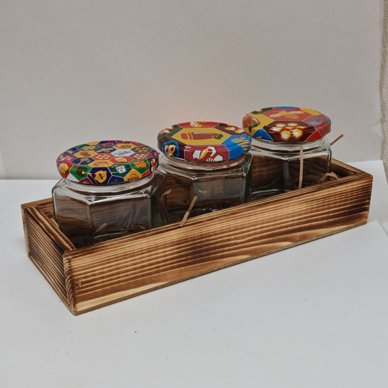 В наборе: 3 баночки, 3 крышки и деревянный бокс.