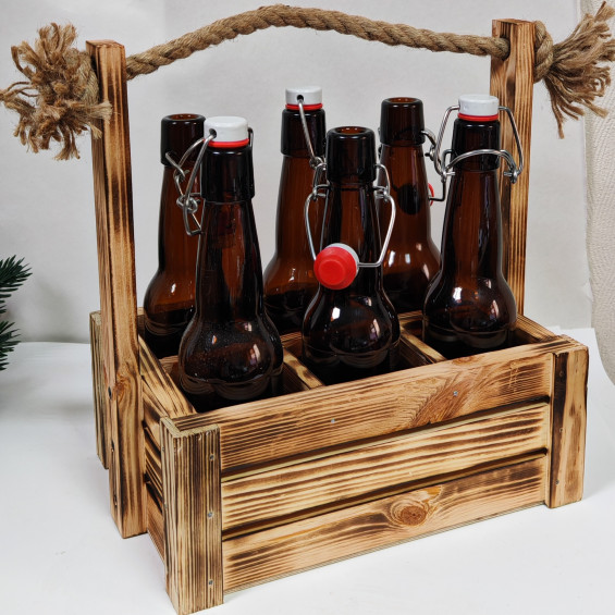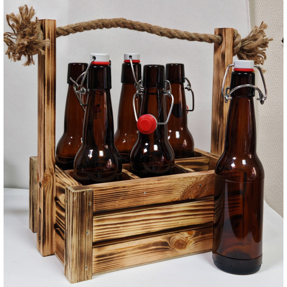 Отличный набор из 6 стеклянных бутылок из темного стекла с бугельным замком 330 мл в боксе с джутовой ручкой