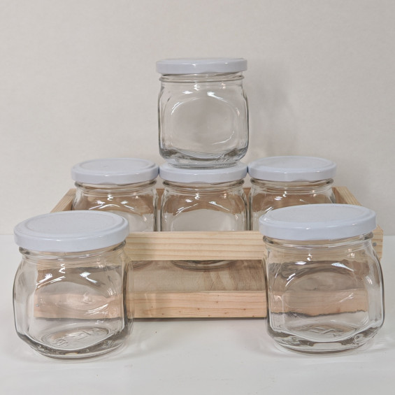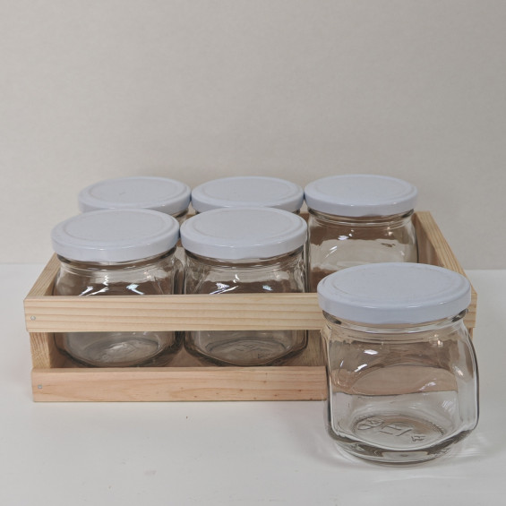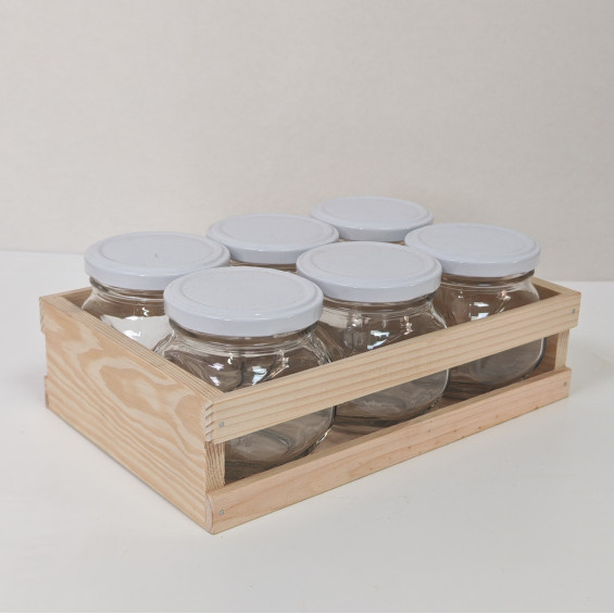 В наборе: 6 баночек (кубик 200мл), 6 крышек. Упаковка деревянный ящичек-поддон.