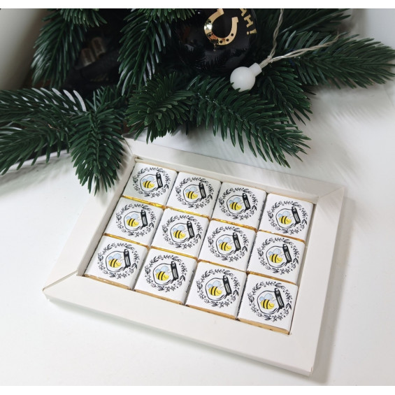 Готовый набор шоколада 12 шт по 5г (Старт), брендированный. В готовом наборе изображение с пчелой, а с обратной стороны предсказания. Заказать можно любое нанесение/изображение. Минимальный заказ 20 наборов. Указанная стоимость набора актуальна, добавится только стоимость разработки дизайн-макета (если понадобится разработка) и, при необходимости, стоимость доставки. При покупке готового набора приобрести можно от 1 шт. Самовывоз по адресу Минск, ул.Семенова, 28-2Н.
