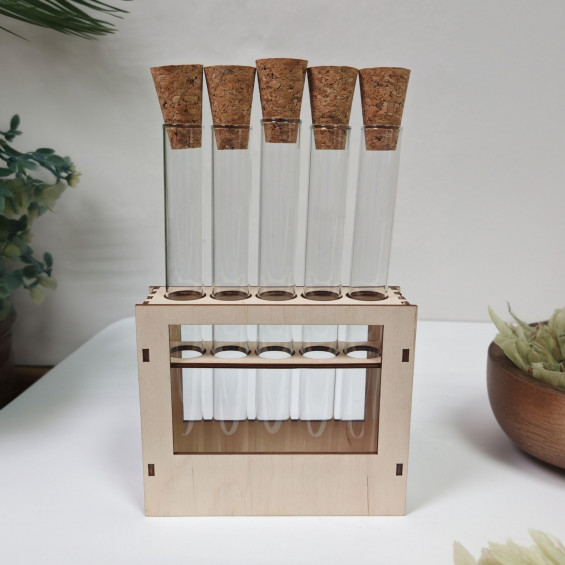 Подставка деревянная штатив для 5 пробирок 60 мл в комплекте. Поставляется в комплекте с 5 пробирками 60 мл и 5 корковыми пробками. Отличный вариант для брендирования (пожелания, памятной подписи, поздравления, логотипа). Забрендировать можете у нас!