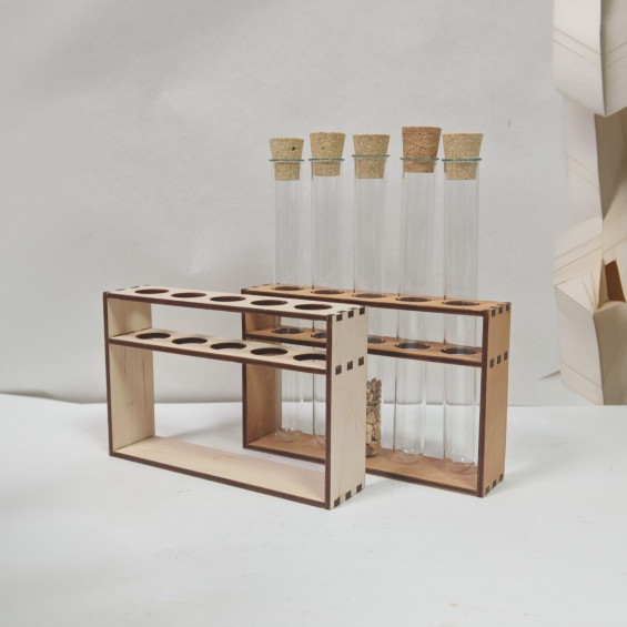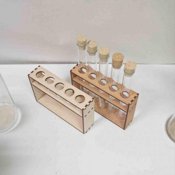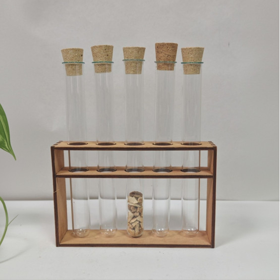 Подставка деревянная штатив для 5 пробирок 20 мл в комплекте. Выполнена из цельного дерева. Поставляется в комплекте с 5 пробирками 20 мл и 5 корковыми пробками.