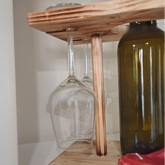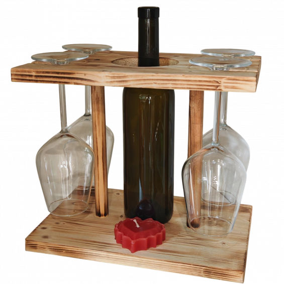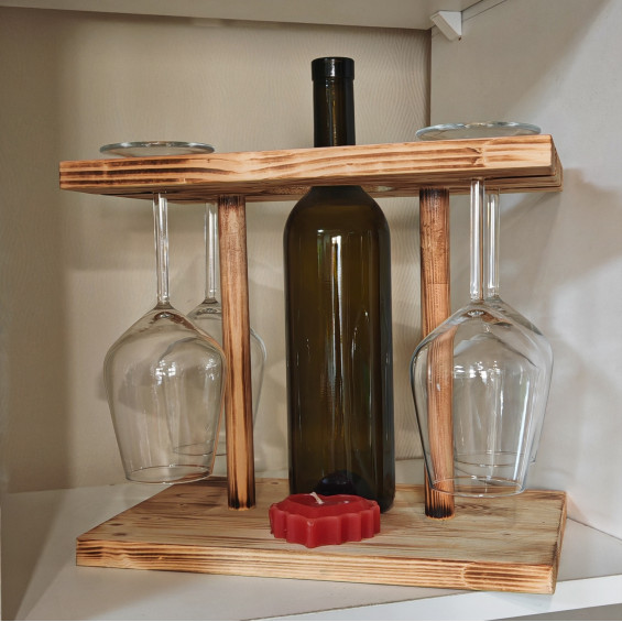 Подставка холдер стойка полка под вино и 4 бокала деревянная. Размер 30х20х26см с ячейками для бутылки и 4х бокалов. Удобное приспособление для мини-пикника на природе, посиделок дома, вполне может заменить столик. В комплекте идет сама подставка-столик и 4 изящных и модных стеклянных бокала Allegra объемом 0.35 мл (75х217 мм). Любимую бутылку вина приобретаете отдельно. А у нас можно приобрести пустые стеклянные бутылки для самодельных не менее вкусных напитков: настоек, наливок, домашнего вина и т.п.